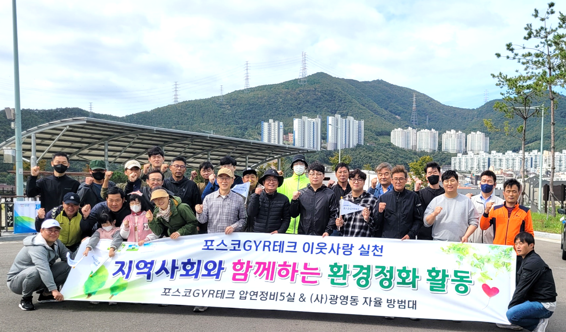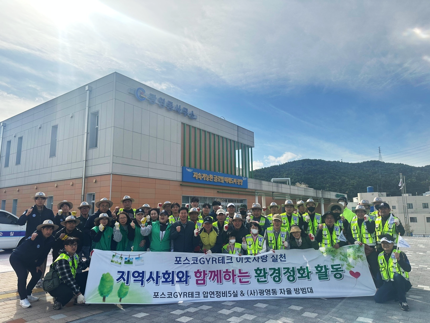 포스코GYR테크 압연정비5실 직원 및 가족들은 지난 10월 20일(일), 광영동 자율방범대(대장 신대수), 광영동 새마을 부녀회(회장 안영숙)와 함께 광영동사무소 일대에서 환경정화 활동을 펼쳤다. 이번 활동은 지역사회의 환경 보호와 깨끗한 거리 조성을 목적으로 진행되었으며, 오전 10시부터 12시까지 진행되었다.